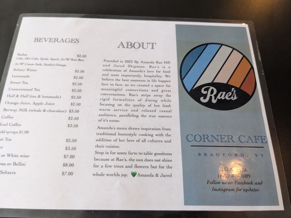 Welcome to Rae’s Corner Cafe, a charming eatery located on 157 Main St, Bradford, VT. This cozy cafe tantalizes patrons with a delightful menu that celebrates fresh ingredients and homemade flavors. Start your day with highlights like the delicious Egg Pastrami sandwich or indulge in sweet Belgian Waffles. For lunch, the menu features savory Paninis, including the classic Reuben and the zesty Buffalo Chicken Wrap, leaving you satisfied and eager for more.